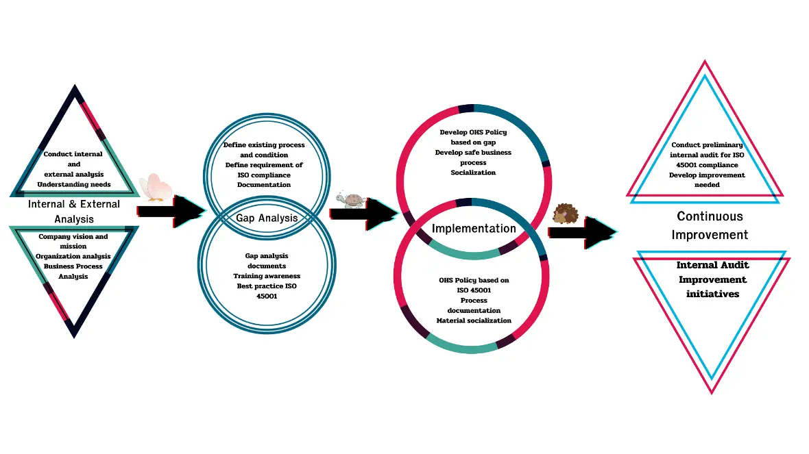 เพื่อลดความเสี่ยงและอันตรายจากการปฏิบัติงาน สำหรับองค์กรที่ได้จัดตั้งระบบการจัดการอื่นๆ เช่น ISO 9001 หรือ 14001 ข้อกำหนดของ ISO 45001 จะได้รับการปรับเปลี่ยนตามนั้น สามารถดำเนินการได้ในกระบวนการระบุอันตราย (Hazard Identification) และ (การประเมินความเสี่ยง) สามารถนำไปปรับใช้ในการจัดทำระบบการจัดการอาชีวอนามัยและความปลอดภัย ISO 45001 ได้ ซึ่งขั้นตอนในการจัดทำระบบจะคล้ายกับ กระบวนการกำหนด ขึ้นระบบการจัดการอื่นๆ ซึ่งประกอบด้วย 6 ขั้นตอน ดังนี้
